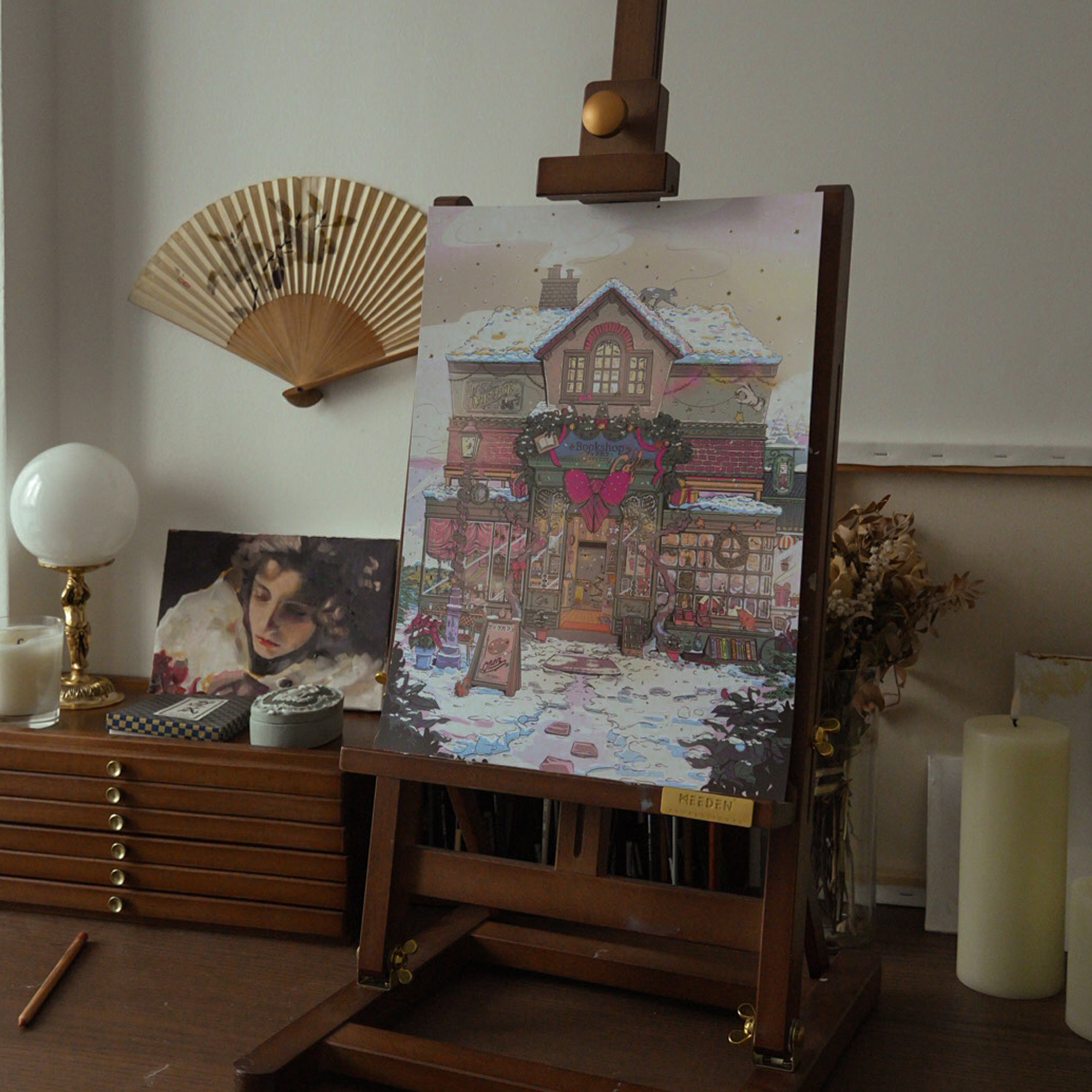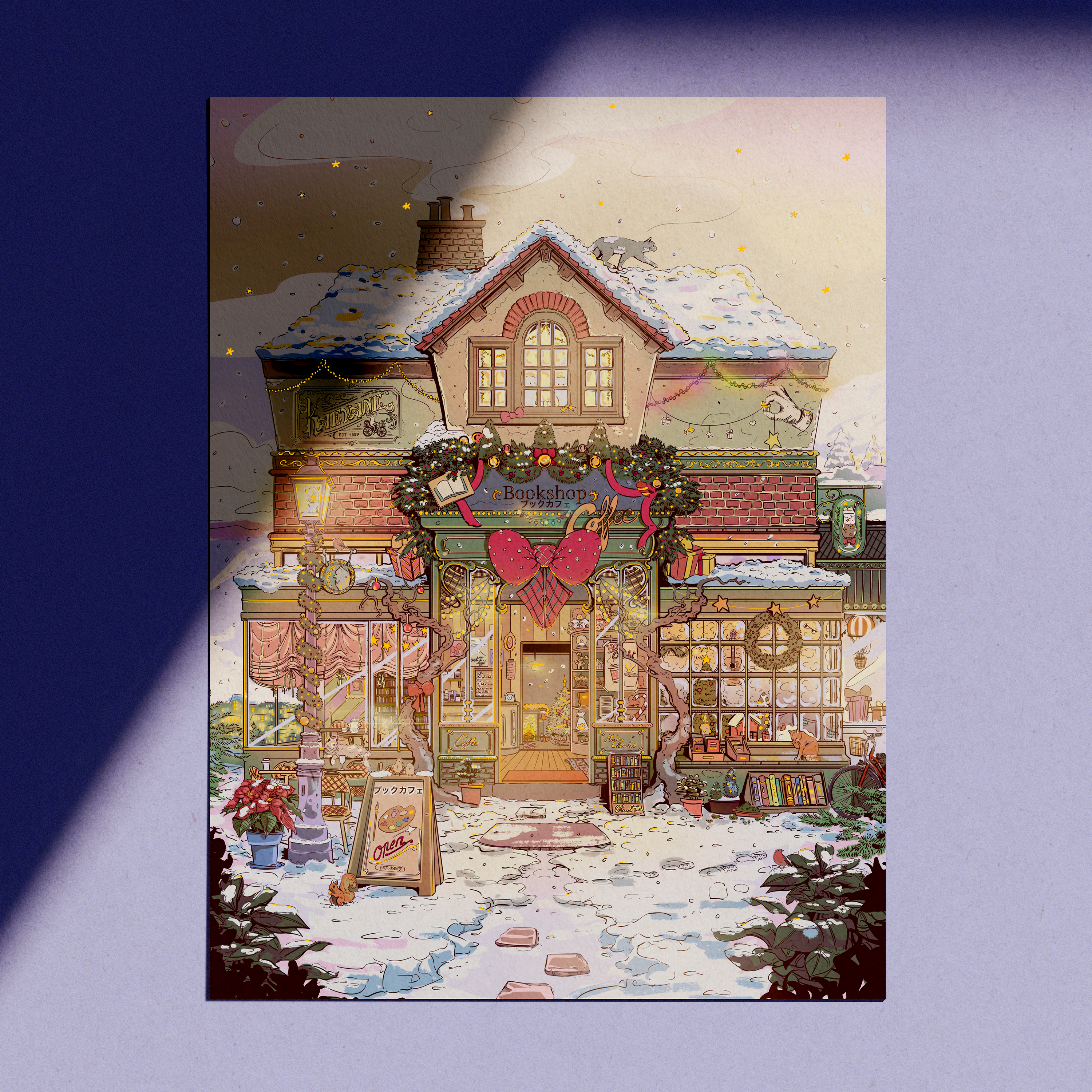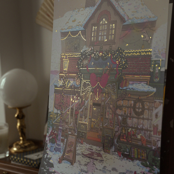 Illustration d’une devanture de librairie enchantée, nichée sous la neige, illuminée par les guirlandes et la chaleur des lumières intérieures. Une scène hivernale douce et réconfortante, où les livres, la magie de Noël et les petits détails du quotidien se mêlent pour créer une atmosphère cosy, presque hors du temps.